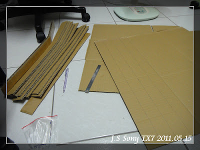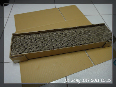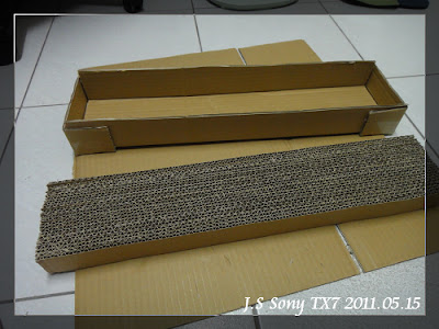 做法很簡單,只要在紙箱上量好大小、畫線條(我是用長60cm、寬5cm),用美工刀切割成條狀(記得要切對方向,切出來的剖面必須是波浪狀的,切錯的話貓咪抓起來就沒fu了),再用白膠一片片黏起來即可(我總共切了24片)。