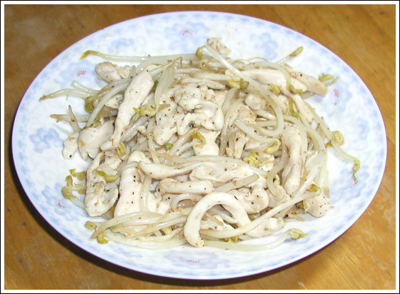 (3)再加點油,先加點鹽將豆芽菜倒入鍋中快炒一下,再將剛剛的雞絲加進去,再加入適量黑胡椒粉,炒熟後即可起鍋。