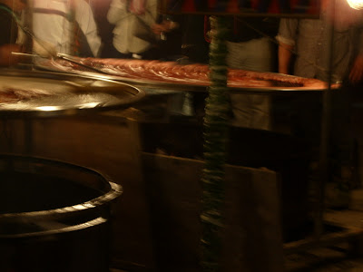 一邊旋轉烤盤一邊烤山豬肉、山豬香腸,