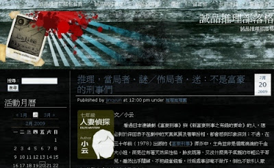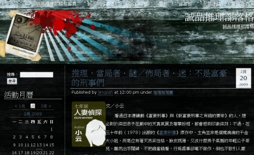 【謎理館】新文:不是富豪的刑事們 by 小云Posted on2009-02-202020-09-16 誠品推理部落格裡,由我撰寫的專欄「推理,當局者.謎/佈局者.迷」,從本期開始,將會固定在每個月的第三個星期五刊登囉!還請各位舊雨新知,多多支持指教~(鞠躬) 本期的文章是「不是富豪的刑事們」,顧名思義就是介紹筒井康隆的作品《富豪刑事》中,活躍於主角身邊的配角們,雖然因為人物眾多、篇幅不夠,使得這些角色在小說中得不到太多的描述,但仔細觀察之後將會發現,其實他們擁有各自的獨特魅力喲!(也因此我這篇文章不小心寫到超過字數啦~) 再次感謝鎮長與栞,兩位友人的幫忙校正文章與提供意見。 貓腳印: 615 Related posts: 【謎理館專欄】不是富豪的刑事們 Blog Plugins 部落格新增日曆 【謎理館】新文:昆蟲世界的愛恨情仇