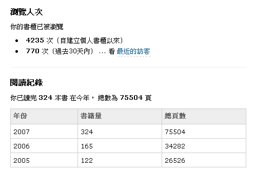 是說,看到這種數值,三百多本,總計七萬五千多頁,大概可以知道我根本是所有時間都花在看書上,也不難理解為何每年近視度數都有增加的趨勢了(笑)。